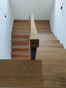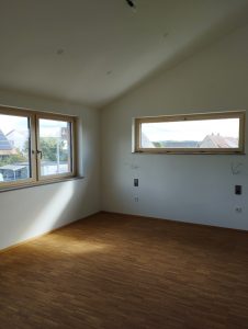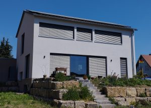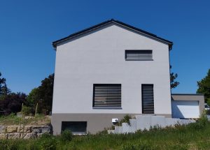 Ein von der Straße aus abfallendes Gelände, beeinflusste die Entscheidung mit Keller zu bauen. Dieser schiebt sich hangseits aus dem Gelände heraus, so dass im KG weitere Wohnräume entstehen konnten.