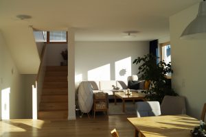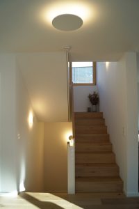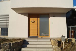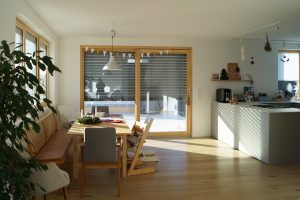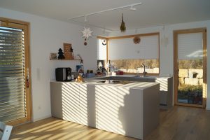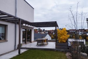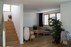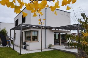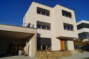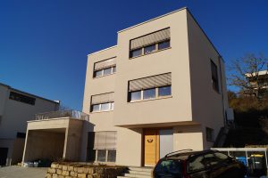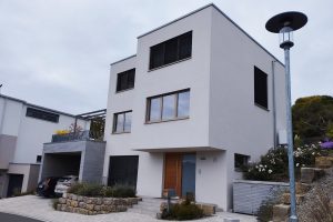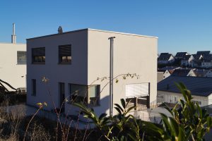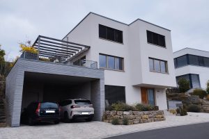 An einem Hanggrundstück in sonniger Aussichtslage entstand ein 3-geschossiges Flachdachhaus mit interessanten Vor- und Rücksprüngen. Diese resultieren aus den Grundrissen der jeweiligen Geschosse. Im ersten und zweiten Obergeschoss bedurften die Wohn- und Schlafräume einer größeren Grundfläche als die Gäste- und Nebenräume im Eingangsgeschoss. Der Vorsprung dient praktischerweise zugleich als Eingangsüberdachung. Das Carport, welches noch mit einer Holzschalung versehen wird, erhält ebenfalls eine weitere Funktion: Das Flachdach ist zugänglich vom mittleren Wohngeschoss und dient als schöne Aussichtsterrasse.