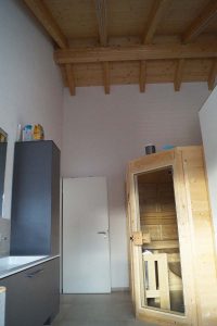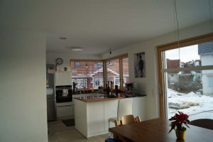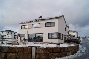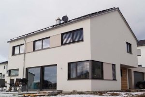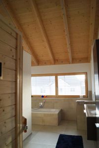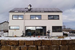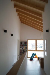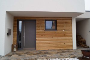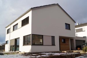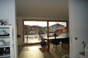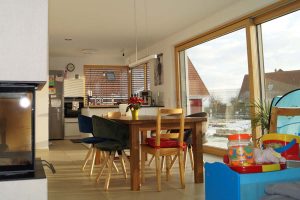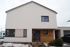 Ein Haus ohne Keller mit offenem Sichtdachstuhl und Bad mit Sauna sollte es für eine vierköpfige Familie werden. Durch die große Hebeschiebetür im Erdgeschoss und die angeschlossene Terrasse verschmilzt der Innen- und Außenbereich. Der zurückgesetzte Hauseingang ist Gestaltungselement und praktikabel zugleich.