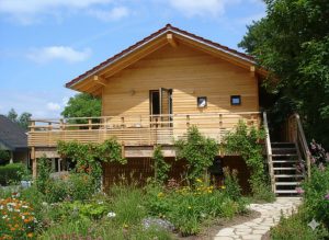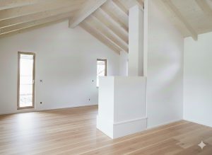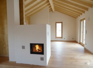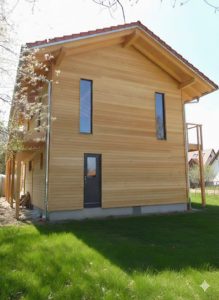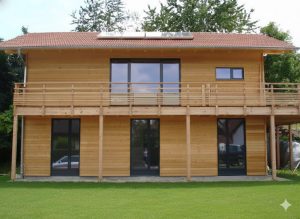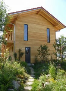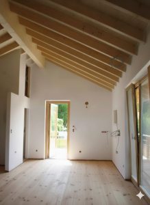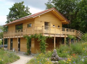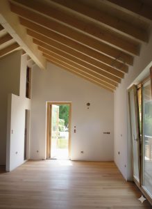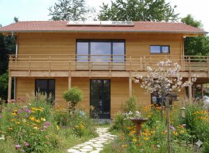 Bei dem Entwurf wurde der offene Wohn-/Ess-/Kochbereich, sowie der Eingangsbereich in das Obergeschoss gelegt. Ein offener Dachstuhl mit Sichtsparren unterstreicht die Großzügigkeit des Raumes. Der umlaufende Balkon mit großer Südterrasse macht bei dem ansonsten schlichten Wohnhaus das „gewisse Etwas“ aus. Eine weitere Besonderheit stellt die Heiztechnik des Hauses dar – hier beheizt allein ein Holzofen (Grundofen) die beiden Geschosse.