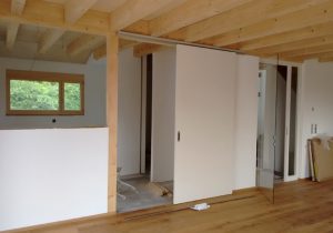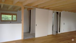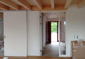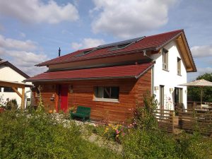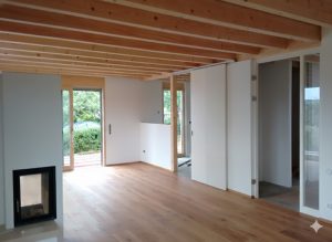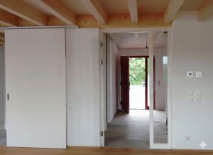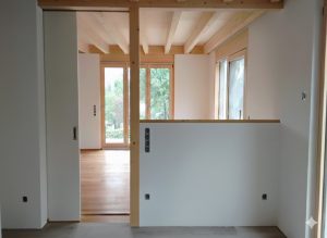 An einem nach Osten hin abfallenden Grundstück entstand ein gemütliches, freundliches Wohnhaus für eine dreiköpfige Familie. Von der Erschließungsstraße aus gelangt man ebenerdig in das mittlere Geschoss, in welchem die Hauptaufenthaltsräume (Wohnen, Essen, Kochen) angeordnet sind. Die Küche ist über eine große Schiebetür und ein inneres Fenster flexibel vom Wohn-/Essraum abtrennbar. Der nach Südosten ausgerichtete Holzbalkon erweitert diesen Bereich. Im Dachgeschoss befinden sich die Schlafräume und im Untergeschoss fand neben Technik- u. Abstellraum noch ein großzügiges, zum Garten hin orientiertes, Arbeits- und Gästezimmer Platz.